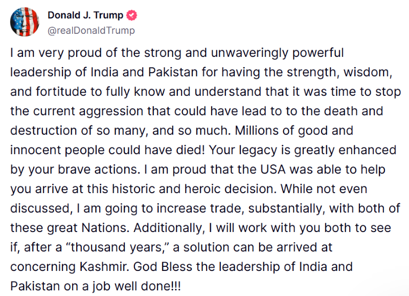 “I am proud that the USA was able to help you arrive at this historic and heroic decision. While not even discussed, I am going to increase trade, substantially, with both of these great Nations. Additionally, I will work with you both to see if, after a “thousand years,” a solution can be arrived at concerning Kashmir. God Bless the leadership of India and Pakistan on a job well done,” he added.