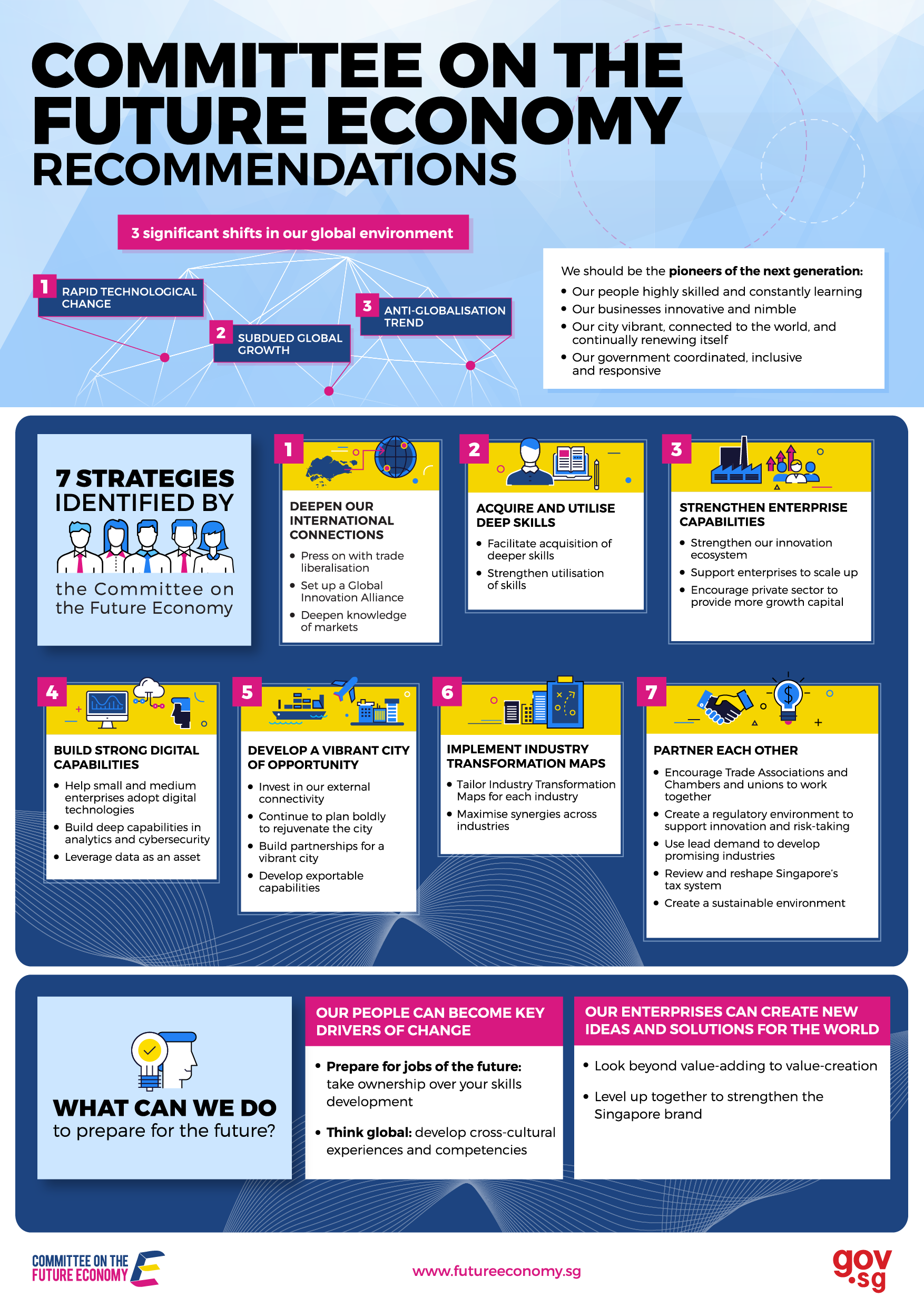 The Committee on the Future Economy (CFE) has laid out the roadmap for development of Singapore and recommended seven strategies that will maximise the chances of the country’s success.
