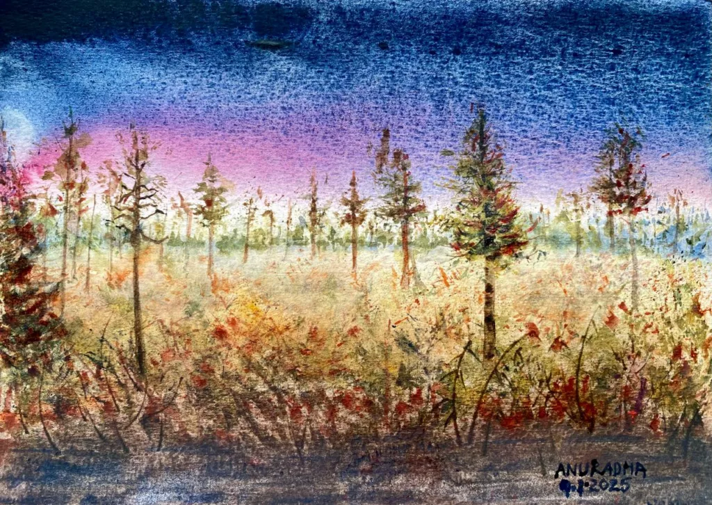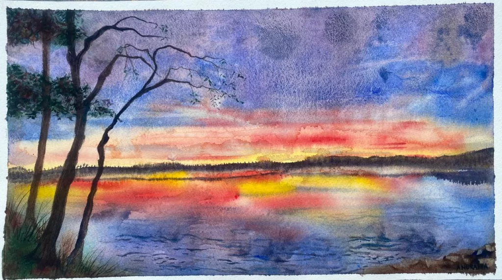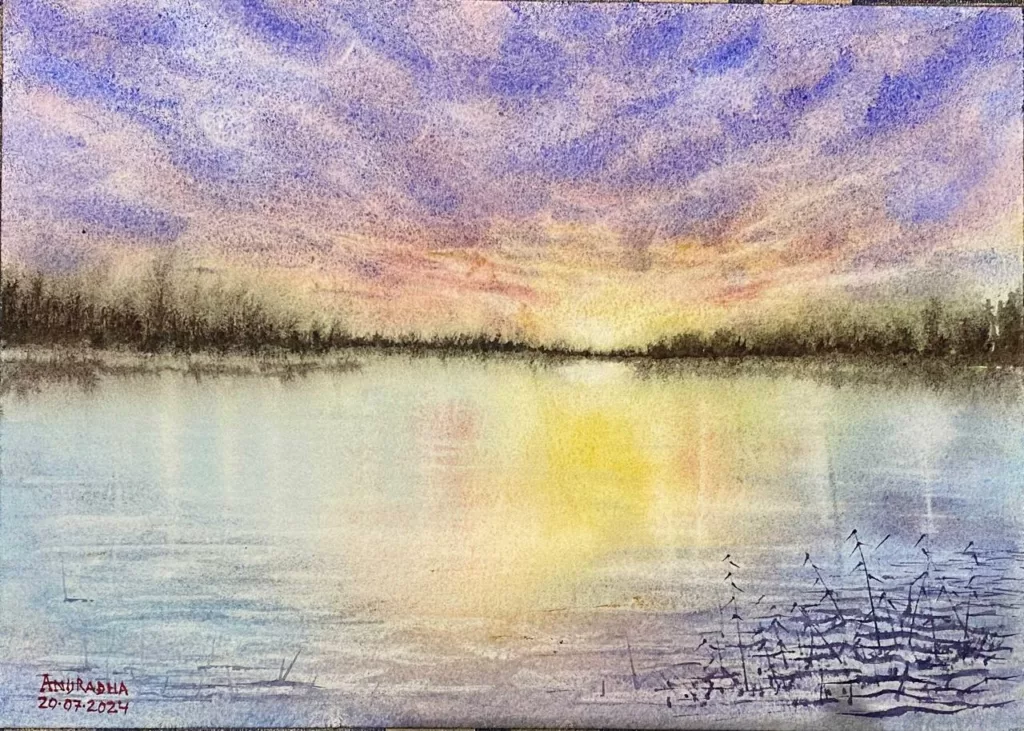 Recently, her journey reached a significant milestone when one of her watercolour paintings — a reflective landscape inspired by her hometown — was selected for Olympiart 2024, an international exhibition organised by the International Watercolor Society (IWS India). For Anuradha, this moment was both validating and unexpected.