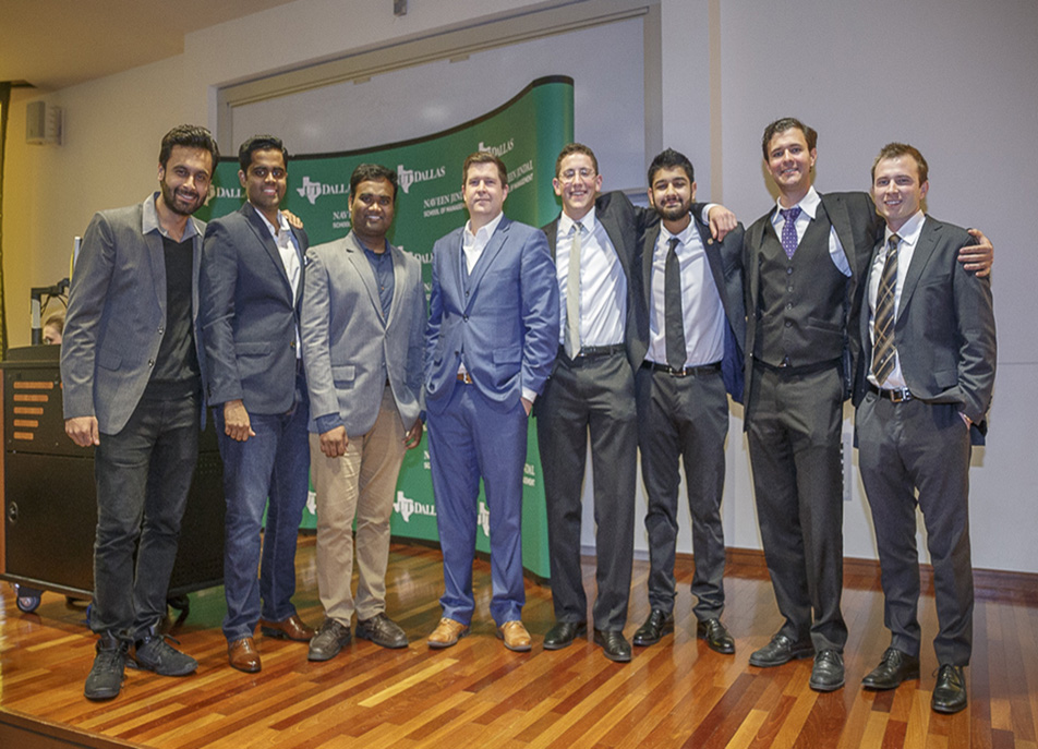 From left: Sanjay Kurani, Abinav Kalidindi and Kiran Achanta of Team Unibees; Jeremy Vickers, executive director of the Institute of Innovation and Entrepreneurship; Benjamin Rubanov and Samir Rahi of Team Skin Aware; and Tom Hauser and Brandon Burgess of Team Geekstyr at the 2016 UT Dallas Business Idea Competition. Photo courtesy: utdallas.edu