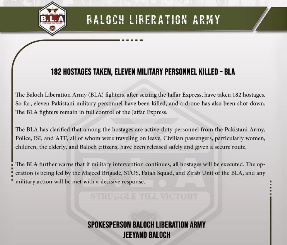 BLA in a media statement, meanwhile, said they have taken 182 hostages and killed 11 Pakistan Army personnel. They claimed they have shot down a drone. The hostages are from Army, Police ISI and ATF, they claimed.